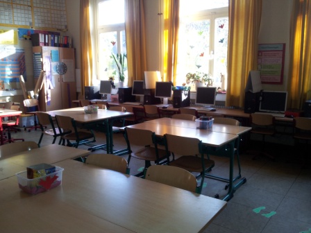 Klassenräume Alle Klassen der Schule haben einen eingenen Klassenraum, den die Klassenlehrerinnen nach ihren Vorstellungen und zusammen mit den Kindern gestaltet haben. Darin finden sich Lernplakate, Freiarbeitsmaterial, aber natürlich auch Bilder aus dem Kunstunterricht. In jeder Klasse gibt es mindestens einen Computer, den die Schülerinnen und Schüler in Freiarbeitsphasen nutzen können, um an Programmen wie der Lernwerkstatt, Antolin oder dem DaZ-Programm "Richtig so!" zu arbeiten. |